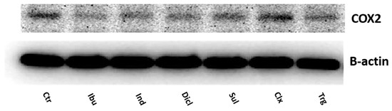 Western blot analysis of COX2 expression in MCF7 cells after 24 h of incubation, with 0.75 mM ibuprofen; 0.5 mM indomethacin; 0.375 mM diclofenac; 0.06 mM sulindac; 0.02 mM celecoxib; and 0.02 mM of troglitazone. For the experiment, 40 µg/lane of protein from the lysates was used. The expression of Β-actin serves as a loading control.
