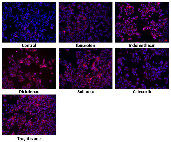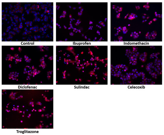 Immunofluorescence staning of p53 expression and its translocation to the nuceli in MCF7 cells treated for 24 h with the following drugs: 0.75 mM ibuprofen; 0.5 mM indomethacin; 0.375 mM diclofenac; 0.06 mM sulindac; 0.02 mM celecoxib; and 0.02 mM of troglitazone. Blue indicates the nuceli, and the red fluorescence represents p53 expression.