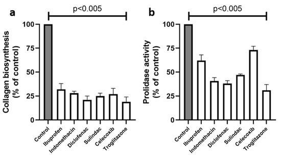 Collagen biosynthesis is coupled to the activity of prolidase, the enzyme supporting proline for the process. As is shown in Figure 9b, NSAIDs significantly inhibited the activity of prolidase. The incubation of MCF7 cells, for 24 h, with ibuprofen, indomethacin, diclofenac, and sulindac, resulted in prolidase activity inhibition to 62, 41, 38, and 47% of the control, respectively. Troglitazone provoked a strong inhibitory potency on the prolidase activity (31% of control), while celecoxib inhibited the enzyme to 73% of the control.