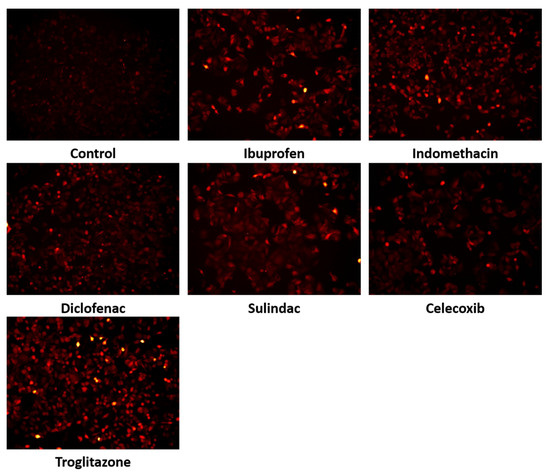 Fluorescence analysis of reactive oxygen species generation due to the POX activation using 0.5 µM of 2′,7′-dichlorofluorescin diacetate staining. Analysis performed on live cells using a survival chamber: 37 °C in 5% CO2. MCF7 cells were incubated with the following drugs: 0.75 mM ibuprofen; 0.5 mM indomethacin; 0.375 mM diclofenac; 0.06 mM sulindac; 0.02 mM celecoxib; and 0.02 mM troglitazone, for the 4 h. Red fluorescence intensity represents amount of generated ROS.