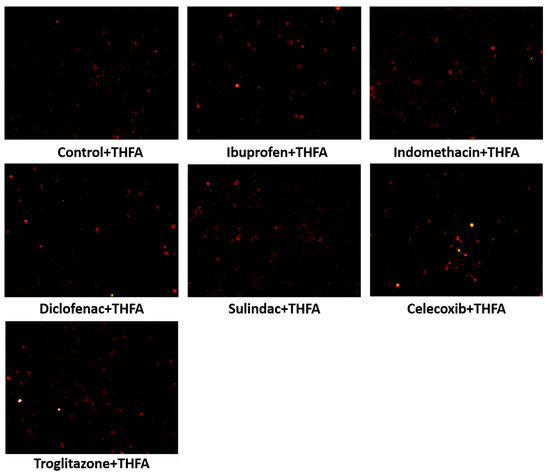 Fluorescence analysis of ROS generation in MCF7 in the presence of THFA (PRODH/POX inhibitor). NSAID POX activation was inhibited by 0.5 h preincubation, with 0.1 mM of THFA. Fluorescence was determined by using 0.5 µM of 2′,7′-dichlorofluorescin diacetate staining. Analysis was performed on live cells using a survival chamber: 37 °C in 5% CO2. After preincubation with THFA, the MCF7 cells were incubated with the following drugs: 0.75 mM ibuprofen; 0.5mM indomethacin; 0.375 mM diclofenac; 0.06 mM sulindac; 0.02 mM celecoxib; and 0.02 mM troglitazone, for the 4 h. Red fluorescence intensity represents amount of generated ROS.