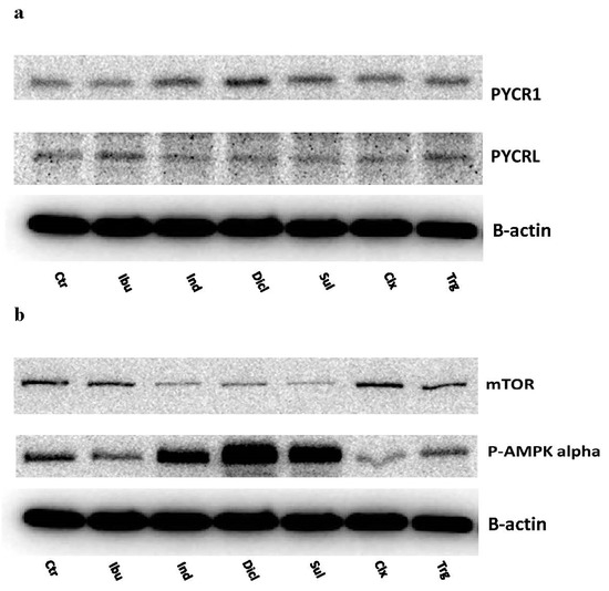 Western blot for PYCR1 and PYCRL (a), and mTOR and p-AMPK alpha (b) expressions in MCF7 cells treated for 24 h with the following drugs: 0.75 mM ibuprofen; 0.5 mM indomethacin; 0.375 mM diclofenac; 0.06 mM sulindac; 0.02 mM celecoxib; and 0.02 mM troglitazone. For the experiment, 40 µg/lane of protein lysates was used.