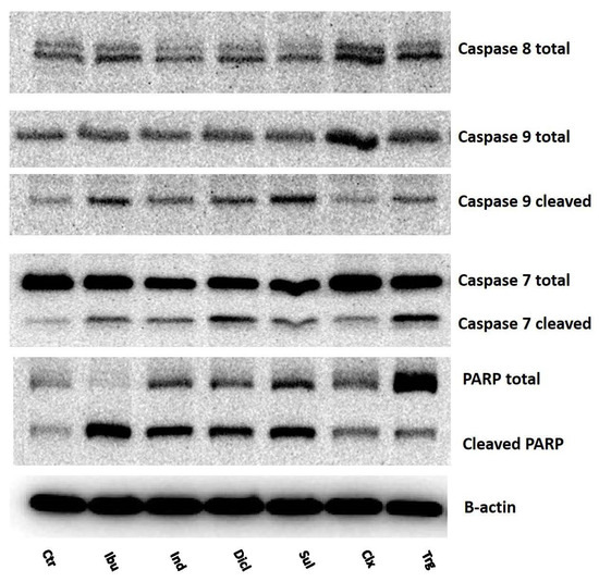 Western blot for caspase-8, caspase-9, and caspase-7 (total and cleaved), PARP, total and cleaved, in MCF7 cells treated for 24 h with the following drugs: 0.75 mM ibuprofen; 0.5 mM indomethacin; 0.375 mM diclofenac; 0.06 mM sulindac; 0.02 mM celecoxib; and 0.02 mM troglitazone. For the experiment, 40 µg/lane of protein lysates was used. Protein expression was normalized versus β-actin expression.