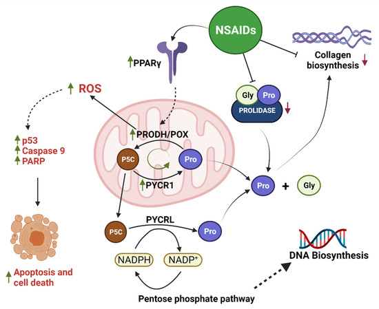 Our report provides new insights into the mechanism of the anticancer activity of NSAIDs. We have found that NSAIDs, as PPARγ agonists, activate PRODH/POX-induced ROS-dependent apoptosis in breast cancer MCF7 cells. The mechanism involves the NSAID-dependent inhibition of collagen biosynthesis (the main proline-consuming process), providing a substrate for PRODH/POX-dependent functions. This suggests that targeting proline metabolism and the PRODH/POX–PPARγ axis can be considered a novel approach for breast cancer treatment.