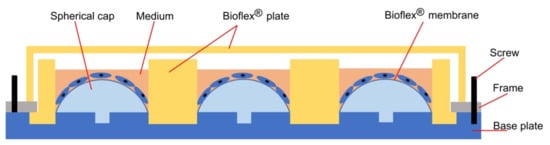 Based on previous publications [,], an apparatus (Figure 1 and Figure 7) was constructed: (1) to apply different magnitudes of static equibiaxial tensile strain to adherent cells and (2) to feed cells without the relaxation of the flexible substrate delivering tensile strain to these cells. The apparatus consisted of five parts: a “base plate”, 3D-printed pinned spherical caps, a BioFlex® Collagen-I coated Culture Plate (BF-3001C, Flexcell Intl. Corp., Hillsborough, NC, USA), a “frame” and screws (Figure 7).