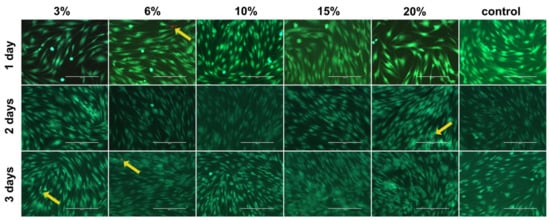Cell viability of human periodontal ligament cells (hPDLCs) as assessed by live/dead cell staining. Microscopic images (bar: 200 μm) of cells growing in the center of each well were used herein, representing different tensile strain magnitudes and durations. Live cells are indicated by green staining, and dead cells are indicated by red staining (yellow arrows).