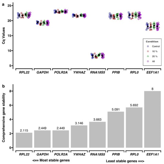 Additionally, the stability of a panel of reference genes was evaluated using samples from the experimental condition and the corresponding controls and analyzed by four different algorithms calculating reference gene stability. Based on the computational analysis, the two most stable reference genes were selected to reduce variations in RT-qPCR experiments [].