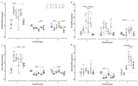 Reverse transcription quantitative real-time polymerase chain reaction (RT-qPCR) results for genes related to bone remodeling after 1 to 3 days of static tensile strain application: (a) RUNX2, (b) SP7, (c) ALPL and (d) BGLAP. Each experimental unit is summarized by mean (⚫) and error bars representing SD. The ΔΔCq method was applied, and RPL22 and POLR2A were used as reference genes. Gene expression of controls is indicated by the gray dashed line. Analysis of differences between the test and control groups was carried out with the Kruskal–Wallis test followed by Bonferroni correction for multiple testing. Significant differences between groups are indicated as follows: *, test group vs. corresponding control; effects of duration: $, 1 day vs. 2 days; @, 1 day vs. 3 days; &, 2 days vs. 3 days; effects of magnitudes (“#”) are indicated by Padj. values; “◯” defines the counterpart of comparisons. Levels of significance: Padj. < 0.05: *, $, @, #; Padj. < 0.01: **, $$, @@, &&, ##; Padj. < 0.001: ***, $$$, &&&, ###.