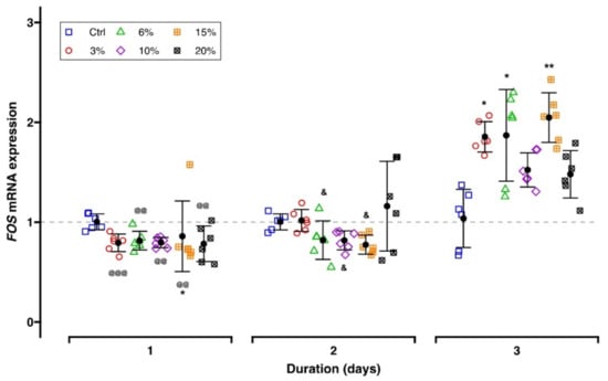 RT-qPCR results of the mechanosensation-related gene FOS. Each experimental unit is summarized by mean (⚫) and error bars representing SD. The ΔΔCq method was applied, and RPL22 and POLR2A were used as reference genes. Gene expression of controls is indicated by the gray dashed line. Analysis of differences between the test and control groups was carried out with the Kruskal–Wallis test followed by Bonferroni correction for multiple testing. Significant differences between groups are indicated as follows: *, test group vs. corresponding control; effects of duration: @, Day 1 vs. Day 3; &, Day 2 vs. Day 3. Levels of significance: Padj. < 0.05: *, &; Padj. < 0.01: **, @@, Padj. < 0.001: @@@.