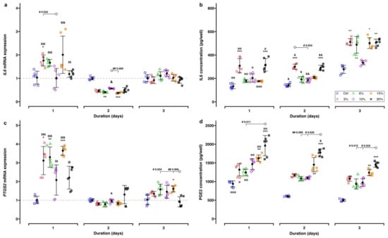 Expression of inflammation-related genes and metabolites: (a) IL6 gene, (b) IL6 in the supernatant, (c) PTGS2 gene, (d) PGE2 in the supernatant. Each experimental unit is summarized by mean (⚫) and error bars representing SD. The ΔΔCq method was applied, and RPL22 and POLR2A were used as reference genes. Gene expression of controls is indicated by the gray dashed line. Analysis of differences between the test and control groups was carried out with the Kruskal–Wallis test followed by Bonferroni correction for multiple testing. Significant differences between groups are indicated as follows: *, test groups vs. corresponding control; effect of tensile strain duration: $, Day 1 vs. Day 2; @, Day 1 vs. Day 3; &, Day 2 vs. Day 3; effect of tensile strain magnitude (“#”) are reported with Padj. values and “◯” defines the counterpart of comparisons. Levels of significance: Padj. < 0.05: *, @, &, #; Padj. < 0.01: **, $$, @@, &&, ##; Padj. < 0.001: ***, $$$, @@@.