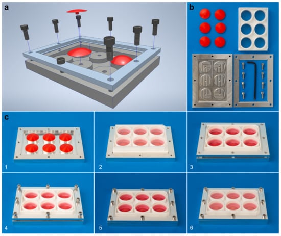 Experimental setup used to apply tensile strain. The apparatus consisted of 5 parts: the base plate, the pinned spherical cap, the BioFlex® plate, the frame and the screws. After assembly, the cell-attached membrane was fitted onto the pinned spherical cap and stretched, producing predefined magnitudes of tensile strain. (a) 3D representation of the apparatus; (b) parts of the apparatus; (c) step-by-step (1–6) assembly of the apparatus.