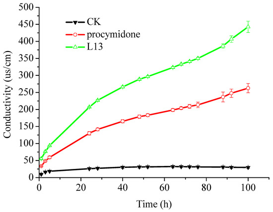 2.2.2. Effect of L13 on Mycelial Electrolyte Leakage of B. cinerea