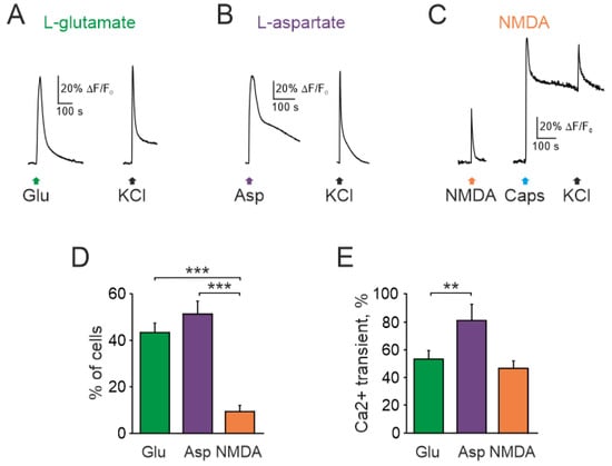 Application of 1 mM glutamate with the co-agonist glycine (10 µM) for 2 s, in magnesium free solution, induced calcium transients in a fraction of TG neurons. Figure 1A–C shows representative traces of calcium responses in neurons. Totally, 44% of neurons (68/156) responded to glutamate (n = 7, Figure 1A,D). Likewise, the other broad-spectrum agonist aspartate (100 µM) with co-agonist glycine (10 µM, 20 s) activated similar number of neurons (51%, 40/78, Figure 1B,D) with larger amplitude of responses to aspartate (53.9 ± 5.3%, 68 cells for glutamate vs. 81.3 ± 11.1%, 40 cells for aspartate, p < 0.01, Figure 1E).