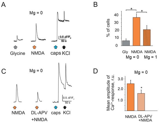 The increase of glycine concentration up to 30 µM elevated the fraction of neurons responded to NMDA to 36.9 ± 4.5% (41/112 cells, n = 3, Figure 2A,B). At the same time only 6.6 ± 2.4% of cells were activated by solely glycine application (8/112 cells, n = 3, p < 0.05). The presence of magnesium in extracellular solution decreased the fraction of responding cells to 20.6 ± 5.2% (32/160 cells, n = 3, p < 0.05). The amplitude of NMDA evoked Ca2+ transients were decreased to 60.1 ± 6.8% by the specific antagonist of NMDA receptor DL-APV (80 µM) (n = 3, Figure 2C,D).