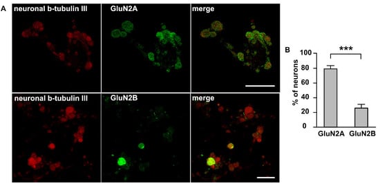 Immunolabeling NMDA receptors in trigeminal ganglion neurons: (A) Immunostaining of GluN2A and GluN2B subunits of NMDA receptor in TG cells; Left column—labelling of β-tubulin III; central column—labelling with GluN2A (top) or GluN2B (bottom) antibodies; right column—overlay. Representative images of the staining are made at original magnification 63 × 1/4. Scale bar: 50 μM (B) Histogram presented the percentage of neurons expressed GluN2A and GluN2B subunits, *** p < 0.001.