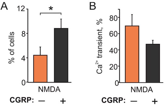 As the neuropeptide CGRP plays a key role in the pathophysiology of migraine [,], we next tested the action of CGRP on NMDA-induced responses. To determine whether the migraine mediator CGRP can increase responses to NMDA, we pre-incubated TG cultures obtained from P12 rats with 1 µM CGRP for 2 h. In control, in these experiments, 11/247 cells responded to NMDA (n = 7). However, after CGRP exposure, the number of responding neurons was almost doubled (28/318 cells, n = 7, p < 0.05, Figure 4A), with a non-significant decrease in amplitude (69.4 ± 14.6% in control vs. 47.6 ± 4.7% after CGRP, p > 0.05, Figure 4B).
