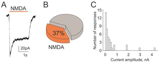 As the independent and direct approach to characterize glutamate responses in TG neurons, we used patch clamp recordings of membrane currents from these cells activated by the local application of NMDA. Application of NMDA (100 µM with glycine 30 µM in magnesium free solution) on TG neurons induced membrane currents in 37% of tested cells (from 110 cells, n = 12, Figure 5A,B). Notably, the amplitude of NMDA currents was very variable ranging from 20 pA to 4 nA (Figure 5C). Thus, in 14 cells of NMDA responsive neurons, membrane currents had the amplitude lower than 100 pA and only in 4 of all tested neurons) of cells they exceeded 1000 pA. These data confirmed functional expression of NMDA receptors in significant number of TG neurons.