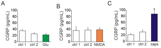Given the key role of CGRP in migraine, we next tested whether activation of glutamate receptors can trigger the release of this migraine mediator from the fraction of peptidergic TG neurons. To this end, we used an enzymatic immune assay (EIA) to detect CGRP released into medium of TG cultures prepared from P12 rats. Samples were sequentially collected in duplicates from well plates in control and after exposure to glutamate agonists. Exposure to 1 mM glutamate did not change the release of CGRP (21.7 ± 3.5 pg/mL, n = 10, Figure 6A) comparing to control (25 ± 4.3 pg/mL, p > 0.05). Similar results were obtained with 100 µM NMDA combined with 10 µM glycine (37.8 ± 12.2 pg/mL in control vs. 38.1 ± 5.8 pg/mL after NMDA with glycine, n = 9, p > 0.05, Figure 6B). In contrast, the potent TRPV1 agonist capsaicin (1 µM), used as a positive control, induced a large CGRP release (89.9 ± 11.7 pg/mL, n = 4, vs. 29 ± 7.4 pg/mL in control, p < 0.05, Figure 6C). Thus, despite the presence of glutamate receptors in neurons, the respective agonist of these receptors did not promote CGRP release.