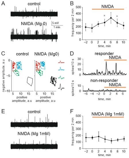 Finally, to test the role of peripheral NMDA receptors in more physiologically relevant conditions we used the whole-mount hemiskull preparation with preserved meningeal innervation with intact peripheral branches of the trigeminal nerve []. Figure 7A shows an example of nociceptive activity in meningeal afferents before (in magnesium-free solution supplemented by 30 µM glycine) and after application of 100 μM NMDA with glycine (30 µM). The global spiking activity of the whole nerve was significantly increased from 179 ± 61 spikes in 2 min before NMDA application (n = 5) to 265 ± 51 and 260 ± 59 spikes by the fourth and eighth minutes of NMDA application, respectively (n = 5, p < 0.05, Figure 7B). Using our novel clustering approach [,,] we performed the neurochemical profiling of nociceptive spiking in different fibers of meningeal afferents. This approach revealed sensitive to NMDA application fibers (so-called ‘responder clusters’) and ‘non-responders’ [] (Figure 7C). Interestingly, there were clusters entirely inactive in control which became very active in the presence of NMDA (Figure 7D). We found 13 such ‘sleeping’ clusters which were activated only after application NMDA characterized by relatively large amplitude of spikes (Figure 7C, right). In general, in five experiments, 32 ± 3% of clusters showed sensitivity (>2-fold increase in mean frequency) to NMDA application.
