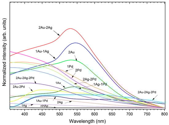 The obtained apatites were further analyzed with UV–Vis spectra (Figure 2) in order to detect characteristic surface plasmon resonance peak (SPR) for metallic nanoparticles. The spectra clearly indicated the formation of AuNPs (peaks at about 530–540 nm) for the apatite doped with Au+ as well double-doped with Au+ and Ag+ [35]. There is a slight boost in the nHAp: 2 mol% Ag+ spectrum—a broad band with a maximum of approximately 423 nm characteristic for AgNPs [36]. Interestingly, the addition of palladium caused a lack of SPR of PdNPs in the UV–Vis spectra. Moreover, for the Pd-apatites co-doped with Au+ and/or Ag+, the plasmon bands of AgNPs and AuNPs were also not observed in the spectra, similar to PdNPs. Sivamaruthi et al. [36] described this phenomenon as an encapsulation with PdNPs, which is thick enough to suppress the SPR peak from AgNPs or AuNPs.