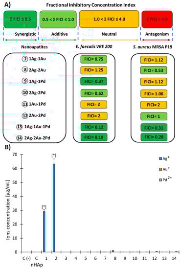 Figure 5. (A) Graphical representation of results of antibacterial interactions between the individual dope of noble metals of nanoapatites against E. faecalis VRE 200 and S. aureus MRSA P19. The interactions were interpreted based on the calculation of the fractional inhibitory concentration index (FICI). (B) The release of metal ions (Ag+; Au+; and Pd2+) from the tested nanoapatites. The concentration of metal ions (µg/mL) was measured in the TSB medium at 37 °C after 48 h of incubation. Control negative (C-) was a pure TSB medium; control (C HAp) was a pure nanohydroxyapatite; mean ± SD, n = 3; * statistically different from the control p < 0.05.