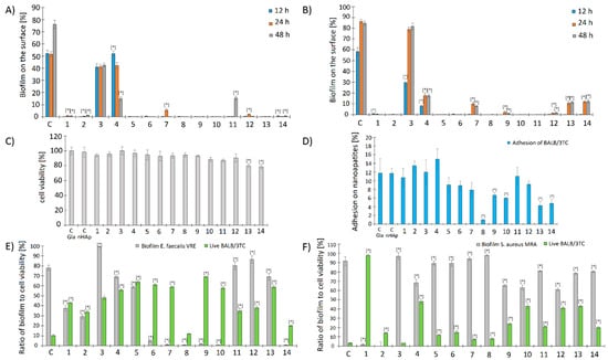 Figure 6. The influence of the studied nanoapatites on the adhesion and biofilm formation by drug-resistant clinical strains of (A) E. faecalis VRE 200 and (B) S. aureus MRSA P19 was determined in three incubation periods (12 h, 24 h, and 48 h). The next graphs show the (C) cytotoxicity (%) and (D) adhesion (%) of Balb/3T3 mouse embryonic fibroblasts to the surface of the tested biomaterials: C HAp-control on nanohydroxyapatite surface and C Gla-control on glass surface. The last graphs show the influence of the biofilm of the tested bacterial strains (E) E. faecalis VRE 200 and (F) S. aureus MRSA P19 on the viability of Balb/3T3 mouse embryonic fibroblasts cells [%] adhered on the surface of the tested biomaterials. Control (C) is pure nanohydroxyapatite; mean ± SD, n = 3; * statistically different from the control p < 0.05.
