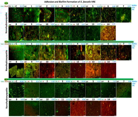 Figure 7. Images from the fluorescence microscopy presenting adhesion and biofilm formation of drug-resistant clinical strains E. faecalis VRE 200 on tested nanoapatites doped with noble metals in three incubation points: 12 h (top), 24 h (middle), and 48 h (bottom). Information above the photos: on the left side, the biofilm viability (Live:Dead) (%); on the right side, biofilm area (%) on surfaces of nanoapatites discs. As a control, pure nanohydroxyapatites discs were used. IDT—indeterminate. Scale bars = 100 µm.