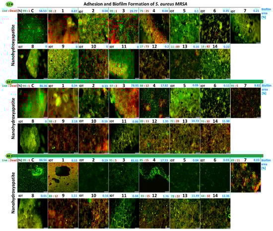 Figure 8. Images from the fluorescence microscopy presenting adhesion and biofilm formation of drug-resistant clinical strains S. aureus MRSA P19 on tested nanoapatites doped with noble metals in three incubation points: 12 h (top), 24 h (middle), and 48 h (bottom). Information above the photos: on the left side, the biofilm viability (Live:Dead) [%]; on the right side, biofilm area (%) on surfaces of nanoapatites discs. As a control, pure nanohydroxyapatites discs were used. IDT—indeterminate. Scale bars = 100 µm.