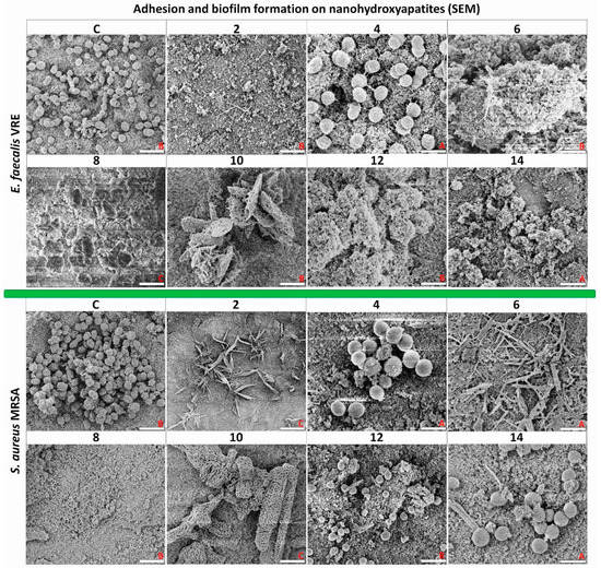 Figure 9. Images obtained by scanning electron microscopy (SEM) visualization demonstrating adhesion and biofilm formation of drug-resistant clinical strains E. faecalis VRE 200 (top) and S. aureus MRSA P19 (bottom) on tested nanoapatites doped with noble metals after a 48 h incubation. As a control, pure nanohydroxyapatites discs were used. Details of the magnification (M) and scale bar (sc) are in the description at the bottom of the images: A = M: 50,000×, sc: 1 µm; B = M: 25,000× sc: 2 µm; C = M: 20,000× sc: 3 µm.