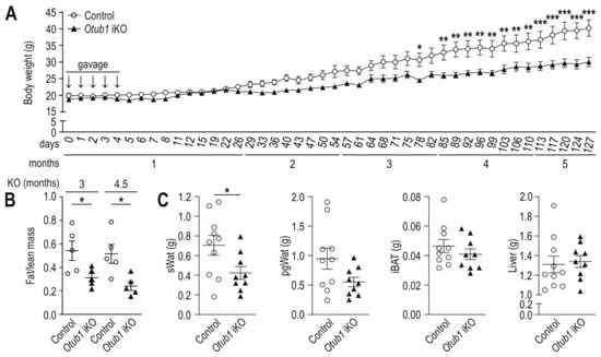 Body weight gain, fat and liver mass in mice with induced whole-body Otub1 KO. (A) Body weight (BW) development following vehicle application (control) or the induction of Otub1 KO in the whole body by tamoxifen treatment (Otub1 iKO) in mice during months 1–5 (n = 5). Vehicle or tamoxifen treatment by gavage was indicated by arrows. (B) Fat mass to lean mass ratio analyzed by EchoMRI in the mice shown in (A) at the indicated time after Otub1 KO (4.5 and 6 months of age; n = 5). (C) Weight of indicated organs (6 months after Otub1 KO; 8.5-month-old mice; 2.5-month-old mice were gavaged with tamoxifen; control, n = 10; Otub1 iKO, n = 9). sWAT, subcutaneous WAT; pgWAT, perigonadal WAT; iBAT, interscapular brown AT. All data are presented as the mean ± SEM. *, p < 0.05; **, p < 0.01; ***, p < 0.001 by two-way ANOVA with Bonferroni post-test (A) or two-tailed Student’s t-test (B,C).