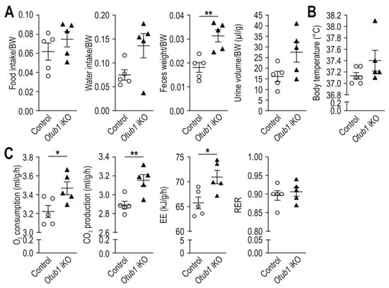 Next, we analyzed possible underlying causes of the observed BW and fat mass decrease. Food and water intake showed a tendency to be increased in Otub1 iKO mice (Figure 2A). In agreement with a higher food and water intake, feces weight and urine volume were also increased (Figure 2A). The body temperature showed a tendency to be higher in mice lacking Otub1 (Figure 2B). O2 consumption, CO2 production and thus energy expenditure were increased during the light cycle in Otub1 iKO mice (Figure 2C). The RER was not altered (Figure 2C), indicating that the oxidized nutrients were the same between the groups. In the dark cycle, corresponding (albeit not significant) results were observed to the light cycle (Figure S1C). Overall, these data suggest a hypermetabolic state in Otub1 iKO mice.