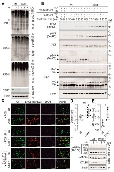 AKT/mTOR signaling in Otub1−/− MEFs. (A,B) Immunoblotting of the indicated (phospho)proteins in mouse embryonic fibroblasts (MEFs) derived from wild-type (Wt) and constitutive Otub1 homozygous KO (Otub1−/−) mice (n = 3). K63-Ub, K63-linked ubiquitin (Ub) chains; K48-Ub, K48-linked Ub chains; FCS, fetal calf serum; aa, amino acids; pre-treatment: 4 h. (C) Immunofluorescence of the indicated (phospho)proteins in MEFs of the indicated genotype. Scale bar, 150 μm. (D) Analysis of the cell diameter of Wt and Otub1−/− MEFs. Each dot (n = 21) represents the analysis of 315 to 1197 single cells. (E) Intracellular ATP levels normalized to total protein content of MEFs (n = 4). (F) Immunoblotting of the indicated (phospho)proteins in Wt and Otub1−/− MEFs (AKT, green; pAKT (Ser473), red; DAPI, blue). exp, exposure time. Representative images are shown and data are presented as the mean ± SEM. Full-length immunoblots are shown in Figures S3–S5. *, p < 0.05; ***, p < 0.001 by two-tailed Student’s t-test.