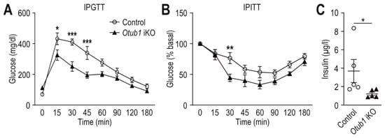 Insulin sensitivity of adult mice with induced Otub1 KO. (A) Intraperitoneal (IP) glucose tolerance test (IPGTT; 2 mg glucose/g; control, n = 4; Otub1 iKO, n = 5) and (B) IP insulin tolerance test (IPITT; 0.75 mU insulin/g; 4 months after Otub1 KO; 5.5-month-old mice; n = 5). (C) Plasma insulin levels in the mice shown in (A) and (B) (5 months after Otub1 KO; 6.5-month-old mice; n = 5) following 4 h of starvation during the light cycle. *, p < 0.05; **, p < 0.01; ***, p < 0.001 by two-way ANOVA with Bonferroni post-test (A,B) or two-tailed Mann–Whitney U test (C).