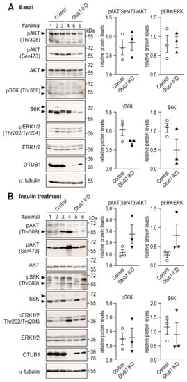 To obtain mice with induced global Otub1 deletion, mice were obtained from the EUCOMM consortium http://www.mousephenotype.org (accessed on 4 January 2022) [] via the EMMA repository https://www.infrafrontier.eu/ (accessed on 4 January 2022) and provided by the Institut Clinique de la Souris, ICS, Illkirch, France) as well as from The Jackson Laboratory (www.jax.org/, accessed on 4 January 2022), and crossed as previously described []. For our analyses, female mice (littermates) were randomly selected and gavaged with vehicle or 200 μg tamoxifen/g (Sigma-Aldrich, St. Louis, MO, USA) at 1.5 months of age (if not specified otherwise). Standard chow diet (Provimi Kliba, Gossau, Switzerland) and water were provided ad libitum, with 12 h light/dark cycles at 21 ± 1 °C under optimal hygienic conditions (OHC), unless indicated otherwise. For the assessment of insulin-dependent signaling in vivo, 0.75 U/kg insulin were intraperitoneally injected, following an overnight fasting period. Organs were harvested 15 min after injection and proteins were extracted. Investigators were blinded during analysis of in vivo data. Animal experiments were approved by the veterinary office of the canton Zurich, Switzerland (license numbers ZH035/16 [approved June 2016], ZH095/19 [approved December 2019]) and all experiments were performed in accordance with the relevant guidelines and regulations.