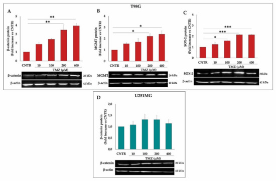 Based on the obtained results on TMZ-resistant T98G regarding the up-regulation of COX-2 by TMZ, we wanted to verify whether TMZ was able to modulate the key proteins closely associated with the activity of COX-2 and strongly implicated in the progression and resistance of GBM. The effects of TMZ on the β-catenin, MGMT, and SOX-2 expression were evaluated after exposure to increasing doses of the alkylating agent (10–400 µM) for 3 days. The results of these experiments show an up-modulation of β-catenin proportional to the increasing concentrations of TMZ in T98G, resulting in being significant at TMZ ≥ 200 µM (Figure 3A). Similarly, the MGMT levels were enhanced accordingly to increasing TMZ concentrations in T98G cells, being significant at 200 and 400 µM (Figure 3B). To assess the effects of TMZ on the stemness potential of T98G cells, we also analyzed SOX-2 levels. A significant and dose-dependent increase in the SOX-2 protein expression was detected at 100 µM, 200 µM, and 400 µM with respect to CNTR (Figure 3C). On the other hand, TMZ did not affect the β-catenin expression in the U251MG cells (Figure 3D). In the MGMT negative (MGMT-) cell line U251MG, the MGMT, as well as SOX-2 expression, was not influenced by TMZ treatment for 3 days (data not shown).