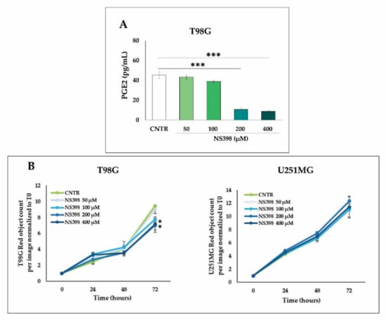 Effects of NS398 on PGE2 release and cell proliferation rate on GBM cell lines. (A) PGE2 levels in supernatants of NS398-treated T98G cells were assayed by ELISA. Results are expressed as mean ± SEM of two experiments performed in duplicate. The one-way ANOVA for repeated measures followed by Dunnett’s post hoc test (*** p < 0.001 vs. CNTR) was used. (B) Effect of NS398 on the cell proliferation rate of T98G and U251MG treated or not (CNTR) for 3 days with NS398 (50–400 μM) was evaluated. Cells were stained with NucLight Rapid Red reagent to detect live and healthy cells, and growth curves of GBM cell lines were analyzed through IncuCyte® Live Cell Imager. The results, relative to one representative out of three experiments performed in triplicate, are expressed as mean ± SD. For comparative analysis of groups of data, two-way repeated-measures ANOVA followed by Dunnett’s post hoc test was used (* p < 0.05 vs. CNTR).