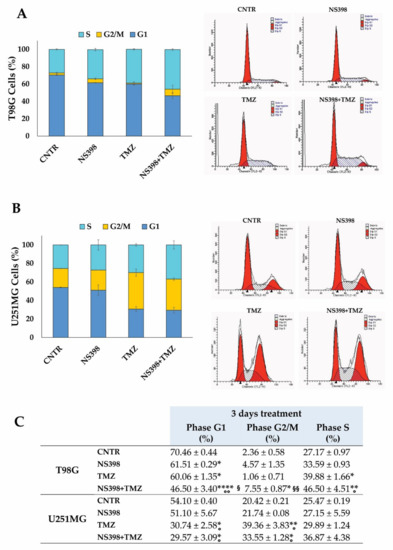 The effect of TMZ, NS398, and their combination on cell cycle distribution by flow cytometry was analyzed on T98G and U251MG. The cell cycle analysis of T98G cells showed that NS398 treatment significantly reduced the percentage of T98G cells in G1. Meanwhile, the presence of TMZ determined not only an evident decrease in cells in G1 but also a clear increase in the S-phase. Of interest, the NS398+TMZ combination altered the cell cycle phase distribution, inducing a significant reduction in G1-phase with respect to CNTR, NS398, and TMZ, with a significant cell accumulation in G2/M-phase with respect to CNTR and TMZ (Figure 6A,C). In the U251MG cells, the treatment with TMZ caused similar effects as the combination, resulting in a reduction in the cell population in the G1 phase, with a clear increase in the G2/M phase fraction when compared with CNTR and NS398-treated cells at 3 days (Figure 6B,C).