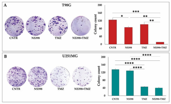 The colony formation assay, or clonogenic assay, is an in vitro cell survival assay, a gold standard technique used for the study of chemical or anti-cancer agents, evaluating the cells’ ability to generate clones following treatment and allowing the evaluation of cytotoxic and/or antiproliferative effects [66]. Briefly, T98G and U251MG were seeded in 6-well plates at a concentration of 1000 cells/well and were incubated at 37 °C overnight for attachment. The next day, cell medium was changed, cells were treated with a single dose of NS398 (200 µM), TMZ (200 µM for T98G and 10 µM for U251MG), and their combination and placed in the CO2 incubator for 3 days. After this treatment, the cells were maintained in a fresh medium until colony formation attested on 20 and 18 days for T98G and U251MG cultures, respectively. Colonies were gently washed, fixed with cold methanol for 20 min, and stained with crystal violet 0.1% in PBS at room temperature for 10 min and air-dried. Colonies were visualized, and images were captured by optical microscopy (Eclipse 50i, Nikon, Tokyo, Japan). Colonies formed were counted using the ColonyCountJ, an add-on program, a semi-automated colony counting program to ImageJ, which provides the number of colonies [67]. The experiment set was carried out twice in duplicate, and histogram plots are the average number from three analyses.