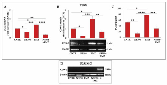 The COX-2 gene expression was assessed through real-time PCR in GBM cells after a 3-day treatment with single agents or their combination, and results are presented in Figure 9A. As reported above, the TMZ exposure induced a relevant and significant COX-2 gene expression in the T98G cell line. Of note, NS398, which alone led to a downmodulation of the basal COX-2 levels, when added together with TMZ, was able to counteract the TMZ-induced COX-2 overexpression in this cell line, revealed by COX-2 mRNA and protein level assay (Figure 9A,B). PGE2 levels’ assay in T98G cell supernatants also confirmed these results, being the PGE2 production affected by treatment in an overlapping way (Figure 9C). On the other hand, COX-2, which was not expressed in U251MG cells, was not affected by any treatments (Figure 9D).