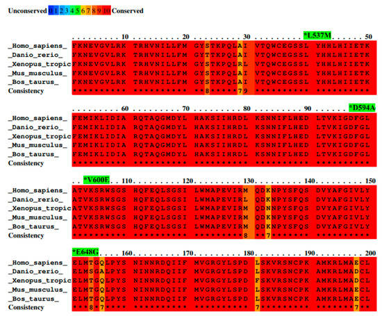 Alignment of BRAF amino acid sequences from different species with mutation sites indicated as *. Sequence alignment was performed between species—Homo sapiens, Mus musculus, Bos taurus, Danio rerio, and Xenopus tropicalis—by PRALINE software. Results are shown as a color-coded pattern. The scoring scheme ranges from 0 (for the least conserved alignment position) (in blue) up to 10 (for the most conserved alignment position) (in red). BRAF mutations selected for study have exhibited the highest conservation score between species.