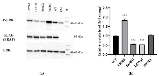 Protein expression measured by Western blot. (a) Expression of ERK-phosphorylated (P-ERK), FLAG (BRAF), and ERK proteins in THLE-2 cells overexpressed with p3XFLAG-CMV empty plasmid (EM), or plasmid containing BRAF WT (WT) and BRAF mutations (V600E, E648G, L537M, D594A). The density of each band was quantified by ImageJ software (b) The protein expression level was normalized to FLAG (BRAF) and presented as a fold change (±SD) of band intensity in the presented blot. The experiment was conducted in four independent replicates (n = 4) and analyzed using a one-way analysis of variance (ANOVA) with Bonferroni correction, *** p < 0.001. The expression of ERK proteins was equal for all samples. M—protein marker 10–245 kDa.