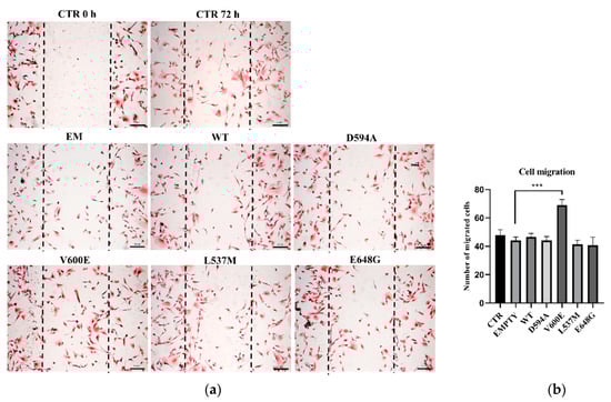 Cell migration assay on THLE-2 cells with overexpression of BRAF mutations. (a) Scratch assay picture of non-transfected (CTR) THLE-2 cells, transfected with BRAF wild type (WT), mutants (D594A, V600E, L537M, E648G), and empty plasmid (EM). Dark dashed lines indicate the trace of the wound front. Scale bar 200 μm. (b) Bar chart with the number of migrated cells (±SEM) for all experimental groups, n = 3, *** p < 0.001. The statistical analysis was carried out using ANOVA with Bonferroni correction.