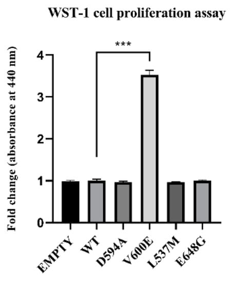 Effect of BRAF mutant overexpression in THLE-2 cells on cell proliferation. A statistically significant augmentation in hepatocyte proliferation, when compared with control, was observed in BRAF V600E-transfected cells. The results are presented as a fold change (±SEM) normalized to BRAF WT-transfected cells. The statistical analysis was carried out using ANOVA with Bonferroni correction, n = 3, *** p < 0.001.