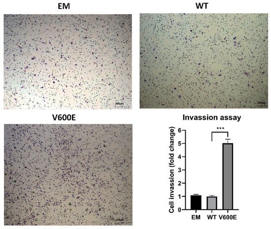 A trans-well migration assay was performed to assess whether BRAF V600E affects the hepatocytes (THLE-2 cells) invasiveness. As a result, THLE-2 cells overexpressed with BRAF V600E significantly enhanced invasion activity (Figure 5) compared with control cells (BRAF WT-transfected cells).