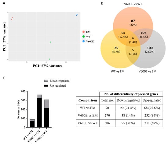 Principal component analysis (PCA) plot and the number of DEGs obtained from BGI RNA-Seq (transcriptome) sequencing. (A) The clustering of color-coded dots indicates high consistency between replicate samples. Dots refer to RNA samples extracted from (1) THLE-2 cells transfected with empty plasmid (EM) are marked in red, (2) BRAF WT-transfected THLE-2 cells (WT) are presented as green, (3) BRAF V600E-transfected THLE-2 cells (V600E) are marked in blue. (B) Venn diagram of DEGs. Three comparisons were analyzed, as follows: WT vs. EM, V600E vs. EM, V600E vs. WT. The overlapping part of the different circles indicates the number of DEGs common to respective groups. (C) The results indicated down-regulated and up-regulated genes in comparisons, as follows: WT vs. EM, V600E vs. EM, and V600E vs. WT. A p-value cut-off of 0.1 after Benjamini–Hochberg multiple-testing correction was used to fulfill the criteria of significance.