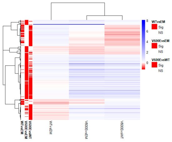 Transcriptome analysis data revealed 436 significantly differentially expressed genes (DEGs) from all experimental variants. The score of 25 genes (5.7%) in WT vs. EM, 100 genes (22.9%) in V600E vs. EM, and 87 genes (20%) in V600E vs. WT comparisons were differentially expressed and unshared between other groups. The number of down-regulated or up-regulated genes distributed among the study groups are presented in the Venn diagram (Figure 6B). The obtained data indicated DEGs in three analyzed comparisons, as follows: 90 significantly DEGs in WT vs. EM (22 down-regulated and 68 up-regulated), 270 DEGs in V600E vs. EM (38 down-regulated and 232 up-regulated), and 306 DEGs in V600E vs. WT (95 down-regulated and 211 up-regulated) (Figure 6C). Moreover, DEGs were presented as a heatmap based on hierarchical clustering analysis (Figure 7). The columns represent WT vs. EM, V600E vs. EM, V600E vs. WT comparisons, where each row represent a gene. The most up- and down-regulated genes are presented in Table 2.