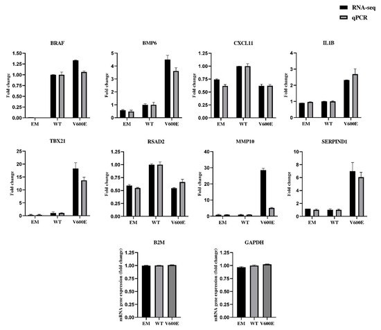 The qPCR results (presented in Figure 8 and Figure S3) confirmed the direction of changes in the genes expression. Genes were extracted for RNA-seq data validation, based on upregulation rate and their potential role in liver cancer development. Consistent data were collected for the following genes: BRAF, bone morphogenetic protein 6 (BMP6), C-X-C motif chemokine ligand 11 (CXCL11), interleukin 1 beta (IL1B), T-box transcription factor 21 (TBX21), radical S-adenosyl methionine domain containing 2 (RSAD2), and serpin family D member 1 (SERPIND1). Matrix metallopeptidase 10 (MMP10) was up-regulated in both RNA-seq and qPCR results but not by the same value. The expression of glyceraldehyde-3-phosphate dehydrogenase (GAPDH) and beta-2-microglobulin (B2M) were examined to identify optimal reference genes for the normalization of target gene expression data. B2M was used as an internal control for qPCR. The same RNA samples were used in qPCR and RNA-seq for assessment of gene expression level.
