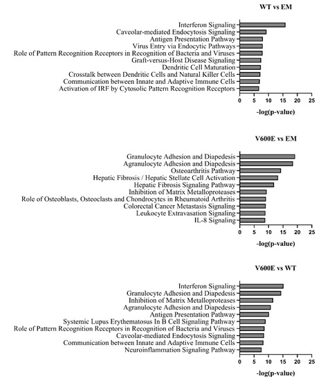 Top 10 significantly dysregulated canonical pathways. The bars present the various pathways in comparisons (WT vs. EM, V600E vs. EM, V600E vs. WT) based on a significant enrichment score (–log(p-value)).