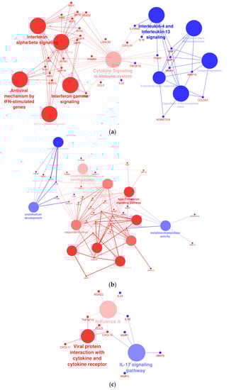 Cytoscape-ClueGo gene network interaction analysis, up- (blue) and down-regulated (red) genes. (a) Overexpression of BRAF V600E in THLE-2 cells influences the interferon- and metalloproteinase-dependent signaling pathways. (b) Analysis pointed out dysregulation of genes involved in the endothelium development and viral response. (c) An enhancement of IL-17 signaling pathway with attenuation of gene expression in response to viral infection and cytokine production.