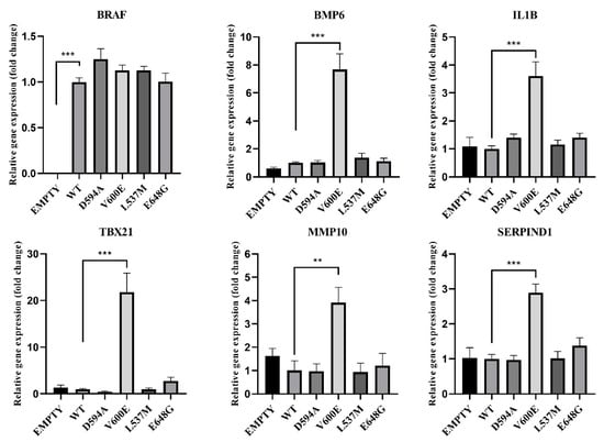 Effects of BRAF mutations on the selected gene expression. A significant upregulation (fold change) of BMP6, IL1B, TBX21, MMP10, and SERPIND1 was seen in BRAF V600E-transfected THLE-2 cells. Results are presented as a fold change in contrast to the expression of BRAF WT-transfected cells (±SEM). B2M was subjected as a reference gene. The statistical analysis was performed using a one-way ANOVA with Bonferroni correction, n = 3, ** p < 0.01, *** p < 0.001.